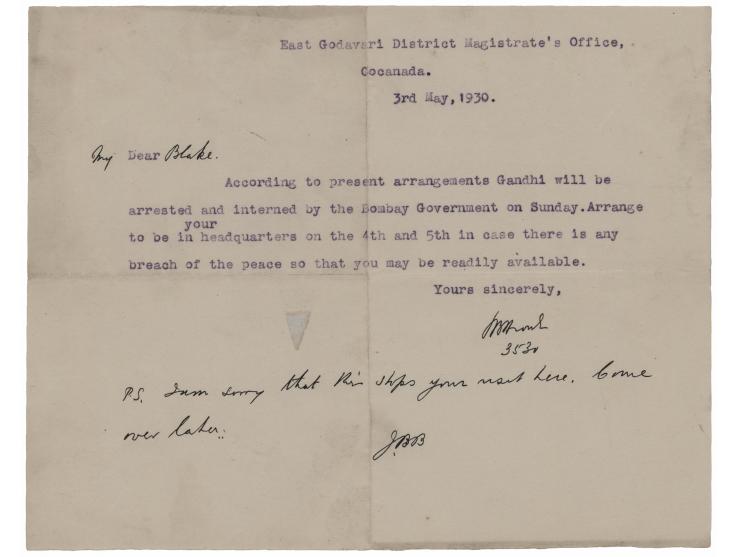 Police order issued to the East Godavari District Magistrate's Office in Cocanada, one page, 8.5 x 6.75, May 3, 1930, related to the arrest of Gandhi following his 'Salt March.' In full: "According to present arrangements Gandhi will be arrested and interned by the Bombay Government on Sunday. Arrange to be in your headquarters on the 4th and 5th in case there is any breach of the peace so that you may be readily available." In fine condition.