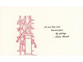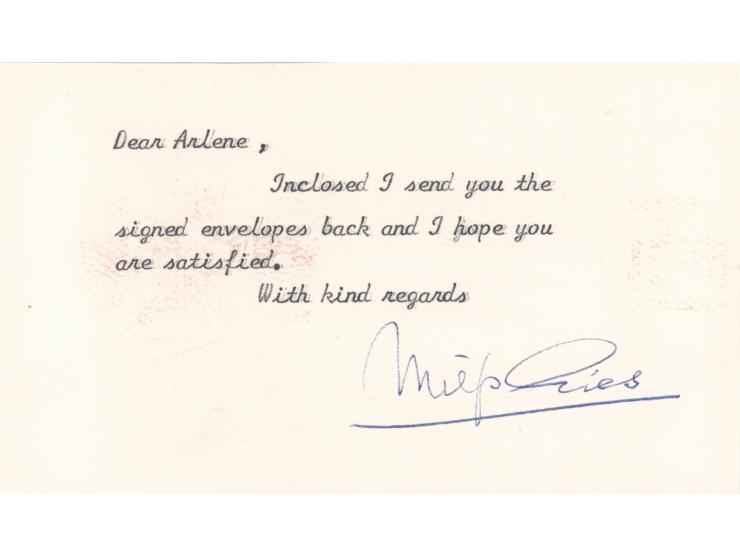 TNS signed “Miep Gies,” one page, 5.5 x 3.25, no date. Note to "Arlene," in part: "Inclosed I send you the signed envelopes back and I hope you are satisfied." In very fine condition.