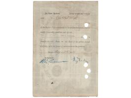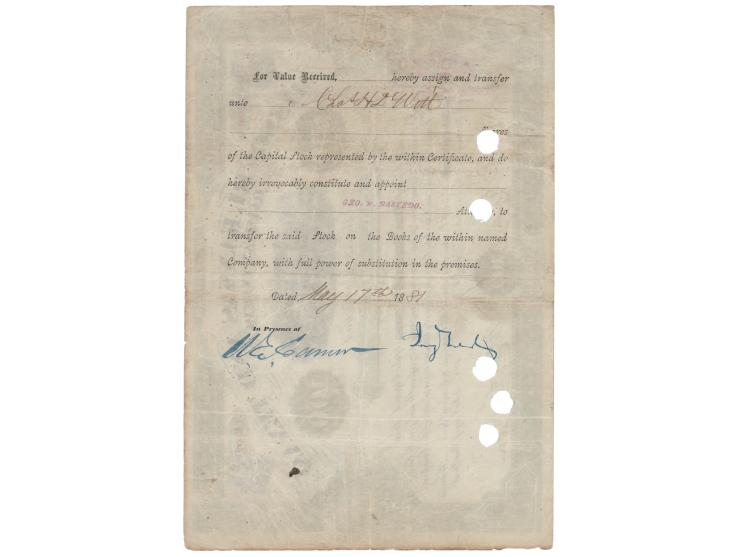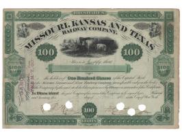 Partly-printed DS, one page, 11.5 x 7.75, May 6, 1881. Stock certificate for 100 shares in the Missouri, Kansas and Texas Railway Company issued to Jay Gould, endorsed on the reverse in blue ink to transfer the shares. In fine condition.