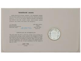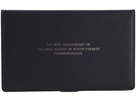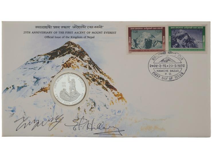 Commemorative cover with a cachet and inlaid medallion honoring the 25th anniversary of the first ascent of Mount Everest, 8 x 4.5, signed in black ballpoint by Edmund Hillary and Tenzing Norgay. Housed in its original presentation wallet, which bears a slice to the inner sleeve. In fine condition.