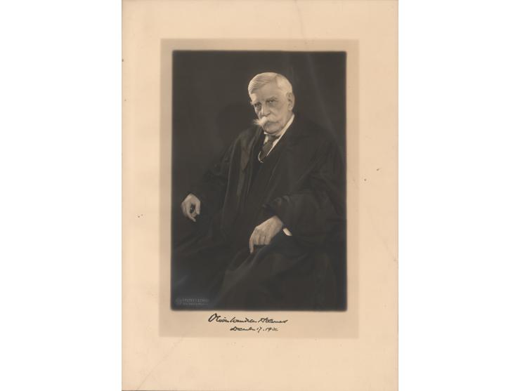 Vintage matte-finish 9.5 x 13.5 portrait of Holmes in his judicial robes by Harris & Ewing, signed in the lower border in fountain pen, "Oliver Wendell Holmes, December 17, 1926." In fine condition, with a short tear to the top edge, and a few thin streaks of light silvering to the image.