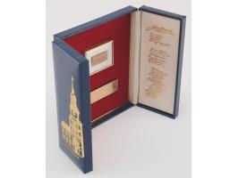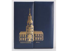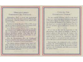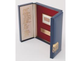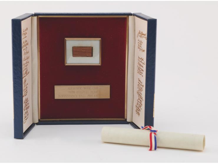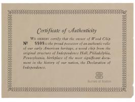 Limited edition display housing a 1˝ x .5˝ wood chip cut from the original cedar beams of Independence Hall in Philadelphia, numbered 8808 of an unspecified edition. Housed in a collector's case with an identification plaque and gold facsimile signatures of some of the signers of the Declaration of Independence. In fine condition. Accompanied by the original box, certificate, and booklet from Burnes of Boston, who released the edition during the bicentennial year of 1976.