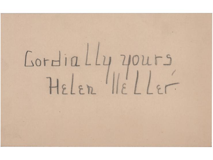 Pencil signature by the disability rights advocate, "Cordially yours, Helen Keller,” on an off-white 5.75 x 3.5 card. In very fine condition.