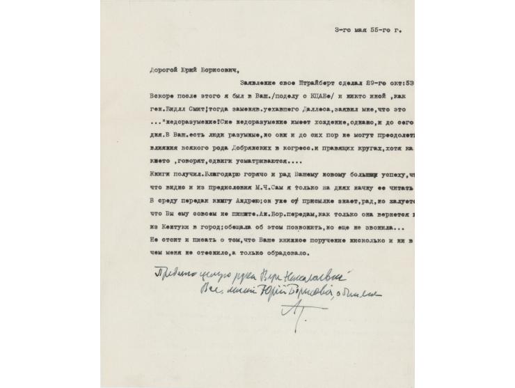 TLS in Russian, signed “AK,” one page, 8 x 10, May 3, 1955. Letter to Yury Borisovich, with a brief handwritten greeting at the close. In part (translated): "Streibert made his statement on October 29, 1953. Soon after that I was in Wash[ington] on the KTSAB matter and none other than General Bedell Smith, who, at that time, was substituting for Dulles, stated to me that it was just 'a misunderstanding.' However, this misunderstanding is still going on and on today. There are wise people in Wash[ington], but to this very day they are not able to overcome the influence of all sorts of Dobiansky's in Congress and in the ruling circles, although they say that some changes are noticeable.