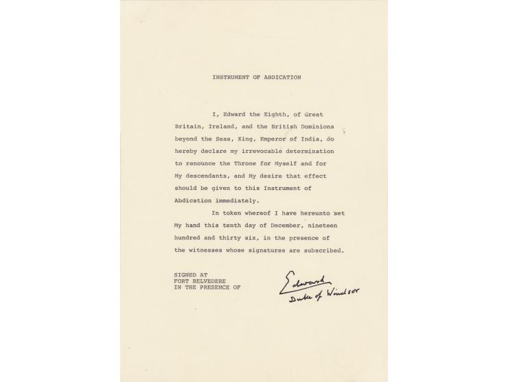 Souvenir typescript of King Edward VIII's "Instrument of Abdication," signed "Edward, Duke of Windsor," one page, 7.25 x 10.25, in part: "I, Edward the Eighth…do hereby declare my irrevocable determination to renounce the Throne for Myself and for My descendants, and My desire that effect should be given to this Instrument of Abdication immediately. In token whereof I have hereunto set My hand this tenth day of December, nineteen hundred and thirty-six." In very fine condition. Edward's intention to marry the divorced American socialite Wallis Simpson caused a British constitutional crisis. Rather than give up his wife-to-be, he decided to abdicate. A historic piece from Edward VIII, who famously chose love over the British throne.