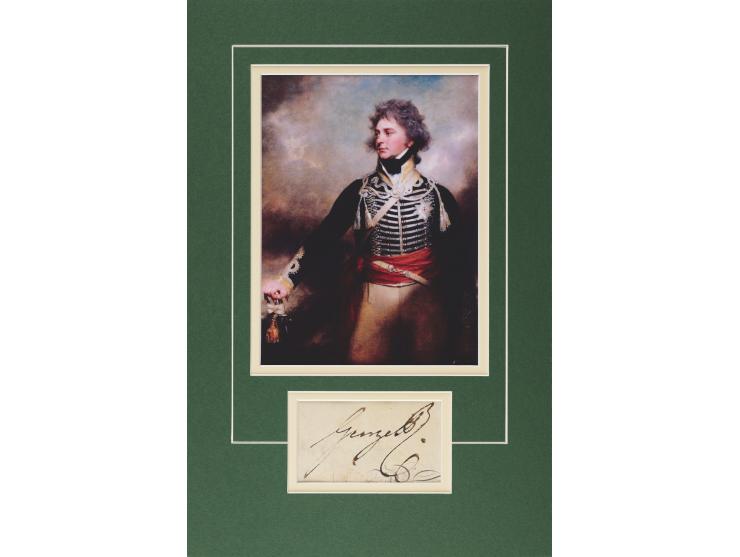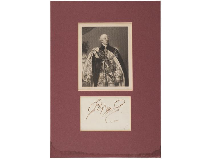 Large ink signature of King George III, "George R.,” on an off-white 3.75 x 2.5 sheet trimmed from a document, which is matted with an engraved portrait to an overall size of 8.25 x 11.75. In fine condition, with staining to the bottom edge of the mat.