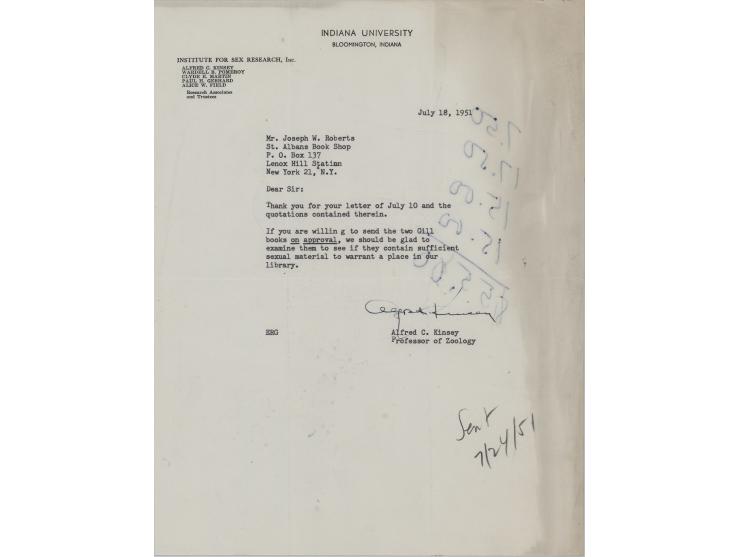 TLS, one page, 8.5 x 11, Indiana University letterhead, July 18, 1951. Letter to Joseph W. Roberts of St. Albans Book Shop, in part: "If you are willing to send the two Gill books on approval, we should be glad to examine them to see if they contain sufficient sexual material to warrant a place in our library." In very good to fine condition, with light creasing and toning to the right edge, and show-through from unrelated calculations on the back.