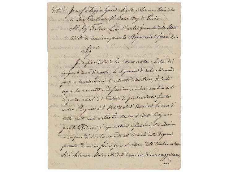 Contemporary manuscript copy of a letter to Tobias Lear by Jusuf Hoggia, three pages on two adjoining sheets, 8 x 10, August 31, 1805. Untranslated letter in Italian pertaining to modifications to a treaty between Tunis and the United States, marked "Copia" at upper left. In fine condition. Lear was responsible for negotiating a peace treaty with the Bey of Tripoli that ended the first Barbary War.