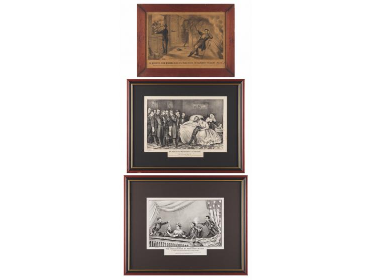 Three engravings related to the assassination and death of President Abraham Lincoln: a 12.75 x 9 engraving by Currier & Ives entitled “The Assassination of President Lincoln, at Ford’s Theatre Washington, D.C. April 14th, 1865”; a 13.75 x 10.25 engraving by Currier & Ives entitled “Death of President Lincoln, at Washington, D.C. April 15th 1865, The Nation’s Martyr”; and a 13.5 x 9.5 engraving by J. L. Magee entitled “The Murderers Doom. Miserable Death of J. Wilkes Booth, The Assassin of President Lincoln / Shot through the head by Sergeant Boston Corbett in a barn on Garrett’s Farm, near Port Royal, near the Rappahannock, April 25, 1865.” Each is individually framed, with sizes ranging from 16.25 x 12.5 to 20.75 x 16.75. Publication dates are unknown. In overall very good to fine condition.