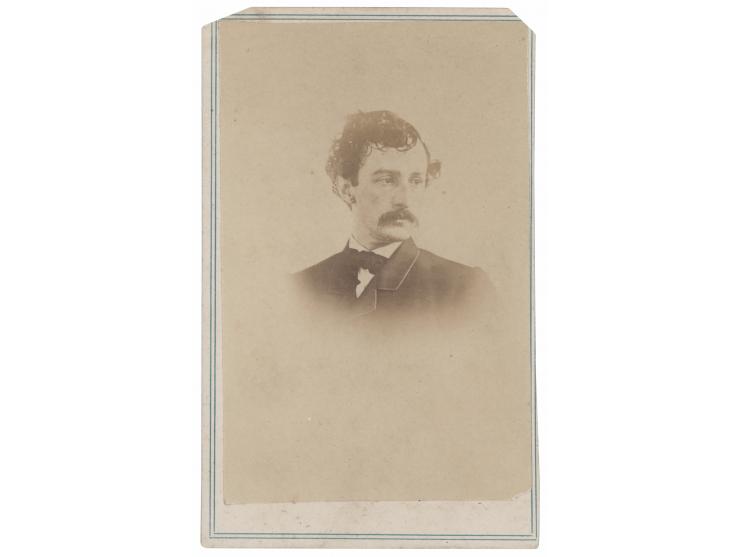 Original 2.5 x 4 carte-de-visite portrait of John Wilkes Booth, taken during a sitting with Norton and Luther in Cleveland, Ohio, in 1864. No back imprint. Listed in John Wilkes Booth Himself by Richard and Kellie Gutman as Booth Image #31. In fine condition, with clipped top corners.