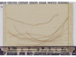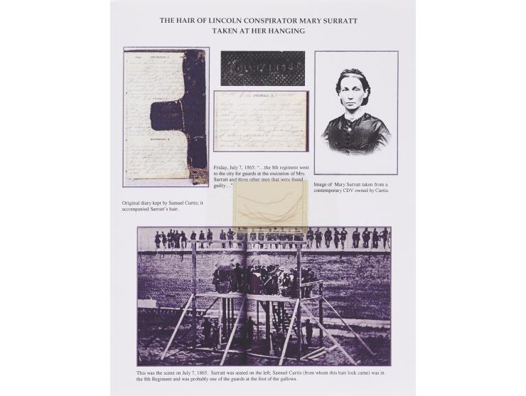 Several strands of Surratt's hair, encapsulated in clear plastic and affixed to an 8.5 x 11 certificate, headed: "The hair of Lincoln conspirator Mary Surratt taken at her hanging." The certificate and an accompanying page reporting that the hair was found in an envelope identified by Samuel Curtis as "The hair [of] Mrs. Surratt." Curtis was a member of the 8th regiment, which served as guards for the execution of the Lincoln assassination conspirators. In fine condition.