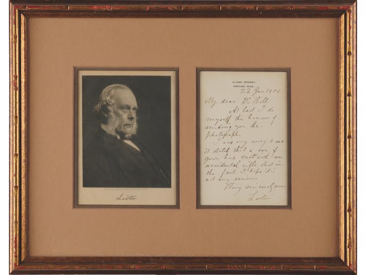ALS signed “Lister,” one page, 3.5 x 5.5, personal letterhead, June 22, 1900. Handwritten letter to "My dear Du Hill," in full: "At last I do myself the honour of sending you the photograph. I was very sorry to see it stated that a son of yours had met with an accidental rifle shot in the foot. I hope it is not very serious." Double-matted and framed with a portrait of Lister (featuring his facsimile signature) to an overall size of 14.5 x 11.5. In fine condition.
