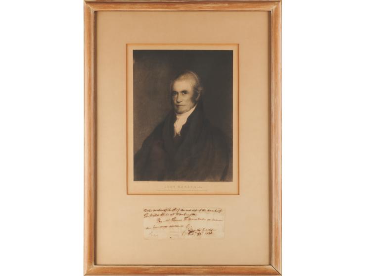 ADS signed "J. Marshall," one page, 7.25 x 2.75, February 23, 1830. Handwritten check "to the cashier of the off. of dis. and dep. of the bank of the United States at Washington," ordering a $100 payment to "Mr. Thomas F. Marshall or bearer." Mounted below a matted engraving of Chief Justice Marshall and framed to an overall size of 17.5 x 25. In fine condition, with mild haloing to the ink.
