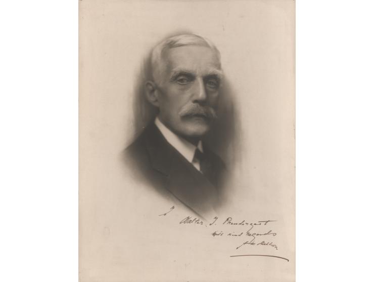 Vintage matte-finish 9.5 x 12.5 portrait photograph of the financier, crisply signed and inscribed in fountain pen, “To Walter T. Prendergast, with kind regards, A. W. Mellon.” Affixed to a same-size cardstock mount and in fine condition.