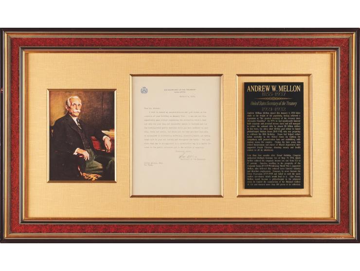 TLS signed “A. W. Mellon,” one page, 7.5 x 10, Secretary of the Treasury letterhead, January 4, 1928. Letter to famed businessman and philanthropist Nathan Straus, who co-owned two of New York City's largest department stores, R. H. Macy & Company and Abraham & Straus.