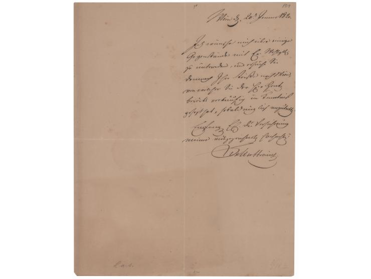 ALS in German, signed “K. Metternich,” one page, 7.75 x 9.75, January 20, 1820. Untranslated handwritten letter referring to a trip to Vienna. In fine condition.