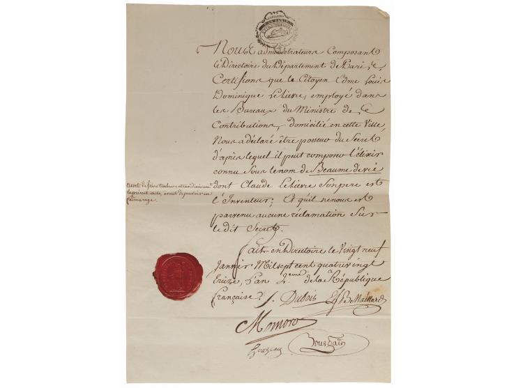 Manuscript DS in French, signed “Momoro,” one page, 8 x 11.5, January 20, 1794. Document certifying "that Citizen Edme Louis Dominique Schiere Lelievre, employed in the offices of the Minister of Contributions, has declared to us to be the bearer of the secret according to which he can compose the elixir known by the name of 'Balm of Life,' of which the inventor is Claude Lelievre, his father." Signed at the conclusion in ink by five members of the Directoire, including Antoine-François Momoro, Etienne Jean-Baptiste Maillard, Denis-Guillaume Bourgain, Dubois, and Houzeau. The red wax seal affixed at lower left is cracked but intact. Housed in a lavish embossed leather folder. In fine condition. Momoro's autograph is scarce, this being the first example we have offered.