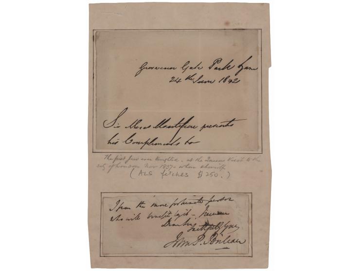 Ink signature, "Sir Moses Montefiore presents his Compliments,” on an off-white 5 x 3.75 sheet, dated at "Grosvenor Gate Park Lane, 24th June 1842." Affixed to a slightly larger album page, with an unidentified signature affixed below. In fine condition.