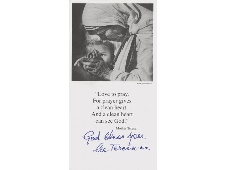 Prayer slip featuring an image of Mother Teresa holding the hand of a small child, 3 x 6, signed at the bottom in blue ink, "God bless you, M Teresa mc." In very fine condition.