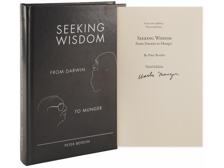Signed book: Seeking Wisdom: From Darwin to Munger by Peter Bevelin. Third edition. Malmo, Sweden: Post Scriptum AB, 2007. Hardcover, 6.5 x 9.75, 318 pages. Signed on the title page in black felt tip by Munger. In very fine condition.