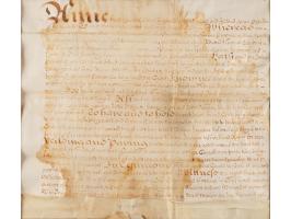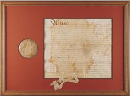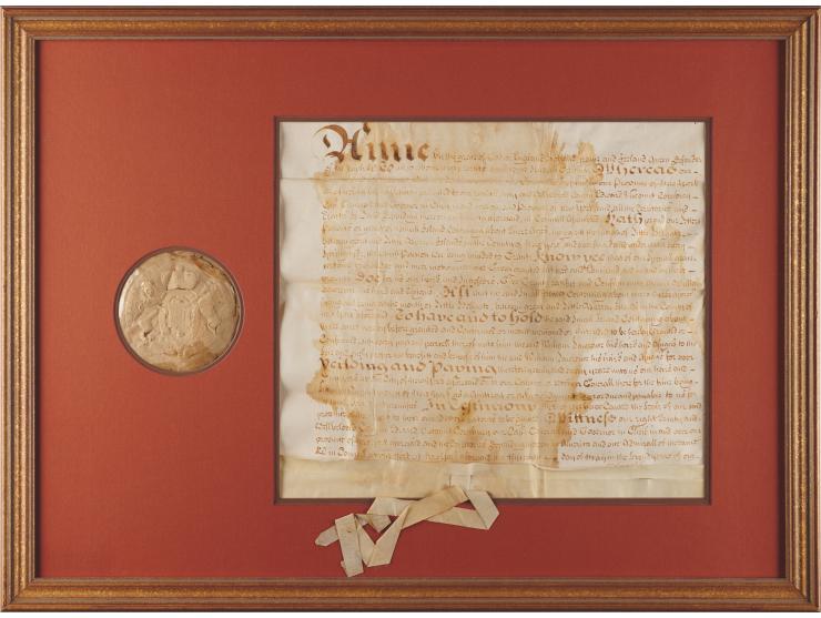 Vellum manuscript document issued in the name of Queen Anne of England, one page, 15 x 13, May 15, 1703. A land grant in favor of William Lawrents for "a small island containing about eight acres, sitting at the mouth of Little Spillgate, and between great and Little Agazzi Islands in the County of New York." The island referred to is probably in the area now known as 'Hellgate,' on the East River, near what is now called North and South Brother Islands. Nicely double-matted and framed with the detached large pendant seal to an overall size of 28.5 x 21. In very good condition, with dampstaining over most of the document, affecting appearance but not readability.