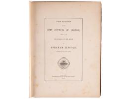 - Proceedings of the City Council of Boston, April 17, 1865, on Occasion of the Death of Abraham Lincoln, President of the United States, hardcover, ‘Printed by Order of the City Council’ (J. E. Farwell & Company, Boston, MA) in 1865.