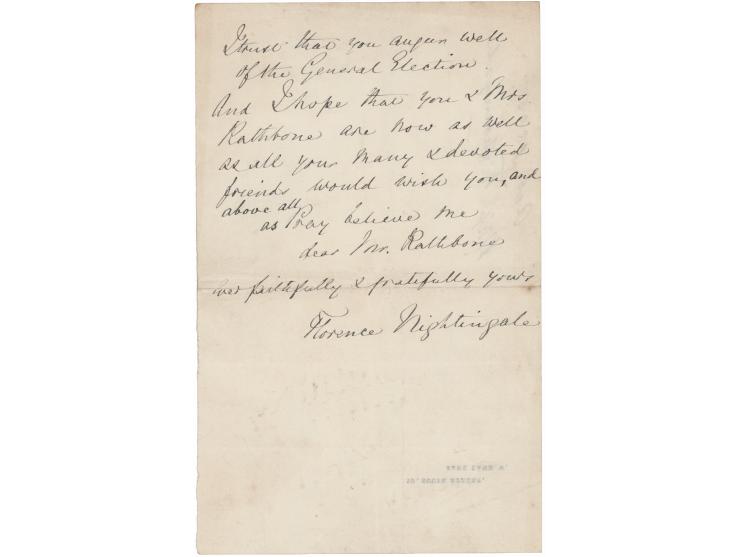 ALS, one page, 5 x 8, 10 South Street, Park Lane letterhead, October 1885. Handwritten letter to “Mr. Rathbone,” likely her friend and collaborator, William Rathbone VI, in full: “I trust that you augur well of the General Election. And I hope that you & Mrs. Rathbone are now as well as all your many & devoted friends would wish you, and above all as Pray believe me, dear Mr Rathbone.” In fine condition.