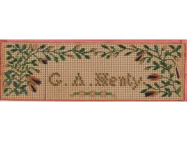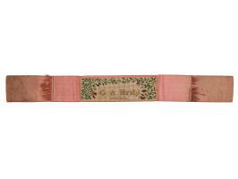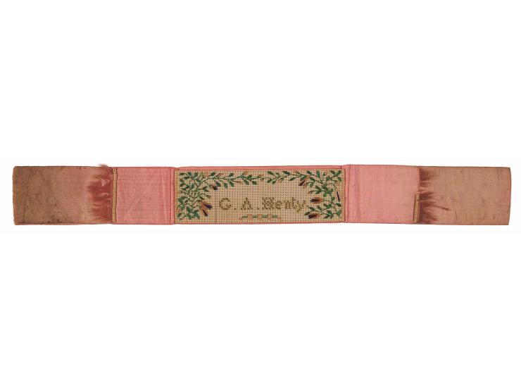 Pink silk bookmark embroidered by Florence Nightingale for English novelist and war correspondent G. A. Henty, measuring 12.5˝ x 1.5˝, with a white patch at center, embroidered with a floral design and his name, "G. A. Henty." Includes a handwritten provenance note from S. Pettit Griffith, Henty's friend and secretary, in part: "The book mark I am sending you was worked by the late Florence Nightingale & presented to Mr. G. A. Henty during the Campaign in the Crimea, where Mr. Henty & his brother Capt. Frederick Henty were engaged. The latter succumbed to cholera, much to the grief of his brother—& his nurse was Nightingale." Housed in a hardcover folder from the "Autograph Collection of Dr. Max Thorek." In fine condition.