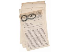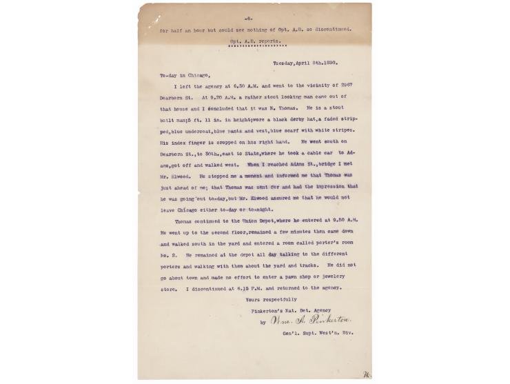 TLS signed “Wm. A. Pinkerton,” six pages, personal Pinkerton's National Detective Agency letterhead, April 8, 1890. Lengthy letter to E. H. Hanson, care of G. N. Bartlett, discussing the progress of an ongoing case related to the theft of “a long diamond pin with gold head and spider…valued at from $250.00 to $400” and a “gentleman’s scarf pin,” which were stolen from Mr. E. H. Hanson and his wife while they traveled on a sleeper train named the ‘Hindostan’ from Denver to Chicago. After determining that the conductor was not the thief, Pinkerton explains that his efforts were then to track down the train’s “negro porter,” a man named N. Thomas, whom Pinkerton believes would soon try to pawn the pins. The letter, which contains an interview with the conductor, W. P. Black, who conveys another story of Thomas’s likely thievery, concludes with Pinkerton following Thomas to his home and then to the depot: “He did not go about town and made no effort to enter a pawn shop or jewelry store.” In fine condition, with a strip of toning along the top edge.