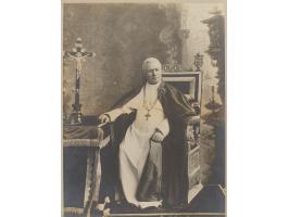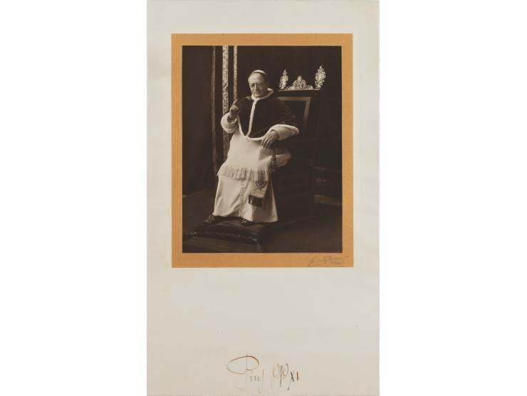 Exceptional official vintage matte-finish 7 x 9 portrait of Pope Pius XI seated, affixed to its original 10.25 x 17.25 mount, prominently signed on the mount in fountain pen, "Pius PP XI." In fine condition, with light edge rippling.