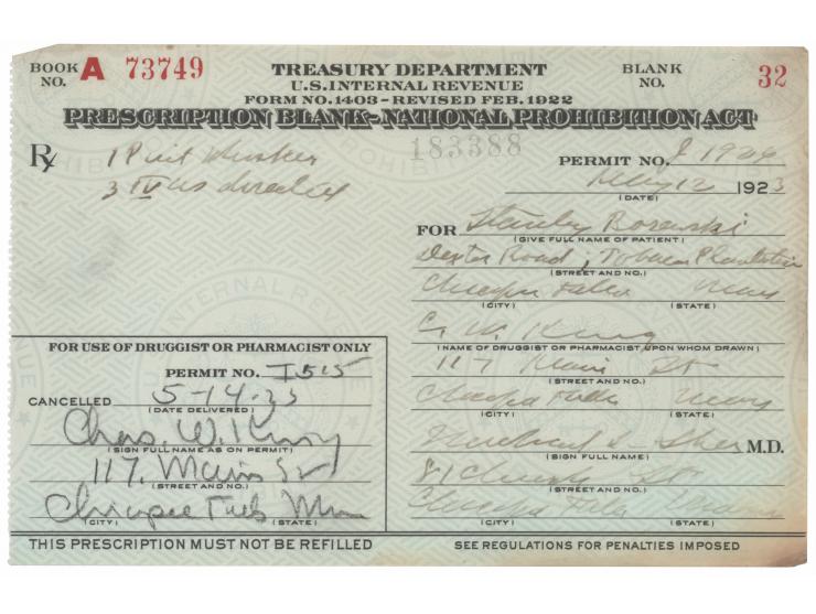 Partly-printed form headed "Prescription Blank - National Prohibition Act," one page, 6.5 x 4.25, May 12, 1923. Issued under the authority of the National Prohibition Act, a medicinal liquor prescription listing the "Rx" as "Whiskey," filled by a pharmacist in Chicopee, Massachusetts. Text printed in the lower left notes: "This prescription must not be refilled." In fine condition, with light edge toning.