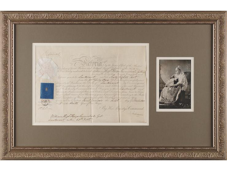 Partly-printed vellum DS, signed “Victoria R,” one page, 13 x 9, November 1, 1845. Queen Victoria appoints William Hugh Hedges Carmichael "to be a Lieutenant in Our Sixty Eighth Foot." Neatly signed at the head in ink by Queen Victoria. The embossed paper seal and blue revenue stamp remain intact. Handsomely double-matted and framed with a portrait to an overall size of 26.25 x 27.5 In fine condition.