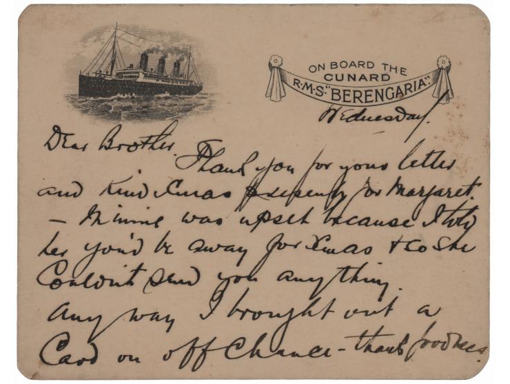 ALS signed "A. H. Rostron," one page both sides, 4.25 x 3.5, "On Board the Cunard, RMS Berengaria" letterhead, January 20, 1926. Handwritten letter to his friend Louis M. Ogden, a New York socialite who was aboard the RMS Carpathia during the Titanic disaster and who helped to photograph, document, and assist the survivors. In full: "Thank you for your letter and kind Xmas present for Margaret—Minnie was upset because I told her you'd be away for Xmas & so she couldn't send you anything. Any way I brought out a card on off chance–thank goodness. We have a quick turn round this time arriving dock 10:30 a.m. & sailing 3 a.m. Thursday!!! Well—I do hope you have a Happy & Merry Xmas & a still happier New Year & every year. I'm up to my eyes in work & am tired out. However—love to both of you darlings & we want to see you." In very fine condition. Accompanied by the original mailing envelope, addressed in Rostron's own hand, with "RMS Olympia" written in the return address area.