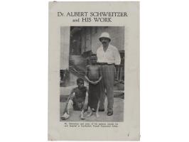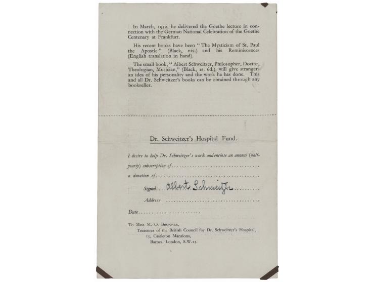Leaflet entitled "Dr. Albert Schweitzer and His Work," two pages, 4.75 x 7.25, providing a brief overview of his humanitarian efforts, signed on the 'Hospital Fund' donation blank on the reverse in fountain pen, "Albert Schweitzer." In fine condition, with a central horizontal fold, and small mounting remnants to corners.