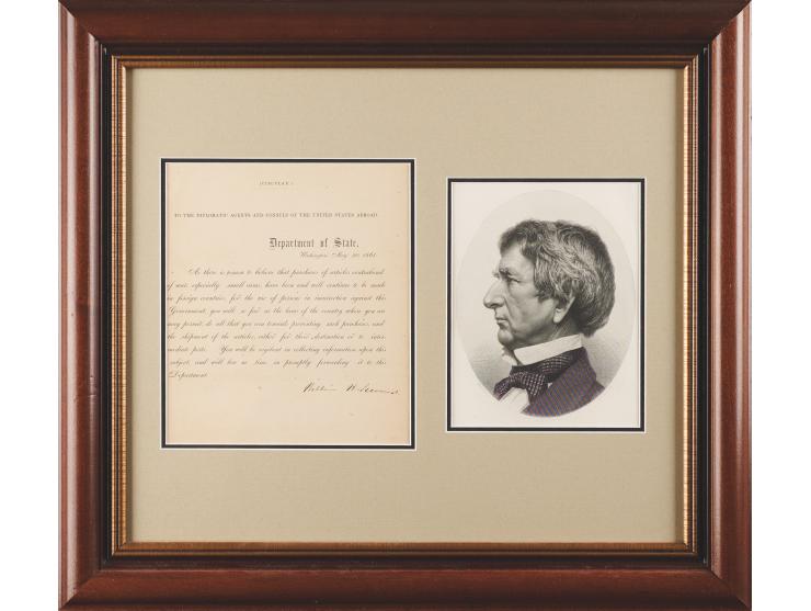 Civil War–dated Department of State circular, signed “William H. Seward,” one page, 7 x 8, May 20, 1861. Printed circular letter to "the diplomatic agents and consuls of the United States abroad," in part: "As there is reason to believe that purchases of articles contraband of war, especially small arms, have been and will continue to be made in foreign countries, for the use of persons in insurrection against this Government, you will, so far as the laws of the country where you are may permit, do all that you can towards preventing such purchases, and the shipment of the articles, either for their destination or to intermediate ports." Double-matted and framed with an engraved portrait to an overall size of 20 x 17.5. In fine condition.
