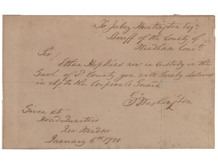 Robert Spring forgery of a handwritten letter signed “Go: Washington,” one page, 7.75 x 4.75, affixed to a larger cardstock mount. A forged letter to "Jabez Huntington…Given at Head Quarters, New Windsor, January 6th 1781," in full: "Ethan Hopkins now in custody in the Gaol of P. County you will hereby deliver in chg. to the Corporal's Guard." Backed by a cardstock sheet and in very good condition, with a repaired vertical crack.