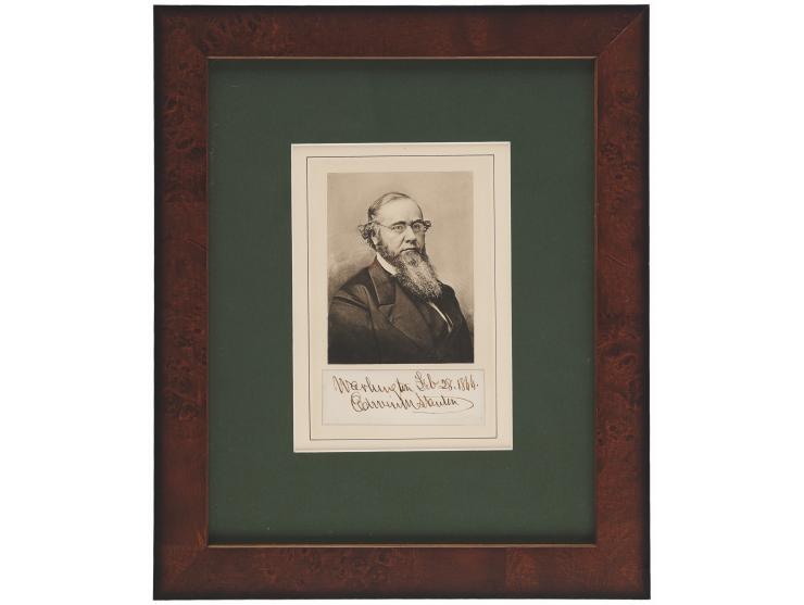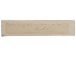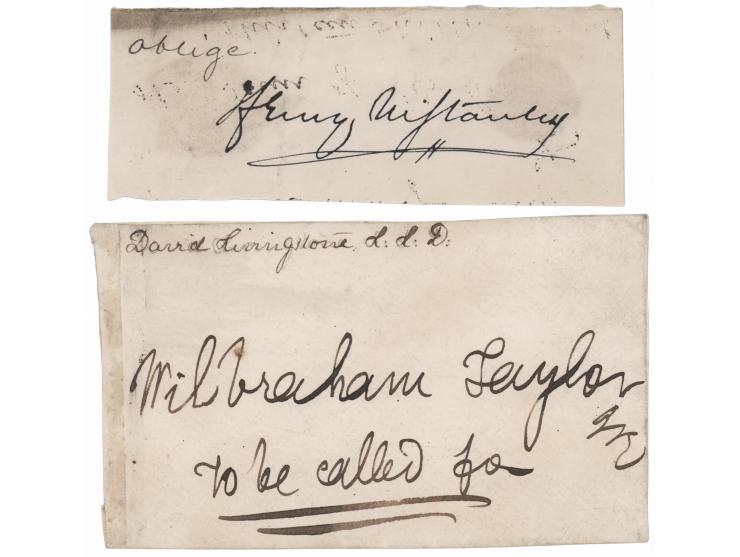 Two items: ink signature, “Henry M. Stanley,” on an off-white 4 x 1.5 sheet; and a clipped mailing envelope panel hand-addressed by David Livingstone, who writes: “Wilbraham Taylor, Esq., to be called for.” An unknown hand has added Livingstone’s name above. In overall very good to fine condition, with some light staining and toning.