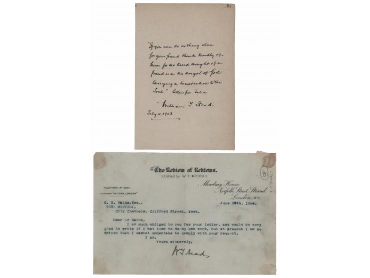 Two items: an AQS signed "William T. Stead," one page, 4.25 x 6.5, February 4, 1903, in full: "'If you can do nothing else for your friend think kindly of him for the kind thought of a friend is as the angel of God carrying a benediction to the Soul.' Letters from India"; and a TLS signed "W. T. Stead," one page, 8 x 5.5, The Review of Reviews letterhead, in full: "I am much obliged to you for your letter, and would be very glad to write if I had time to do my own work, but at present I am so driven that I cannot undertake to comply with your request." In fine condition, with show-through from mounting remnants to the corners of the typed letter.