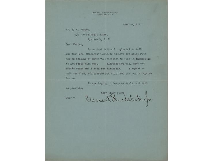 TLS, one page, 8.5 x 11, personal letterhead, June 29, 1914. Letter to W. E. Carter, in part: "In my last letter I neglected to tell you that Mrs. Studebaker expects to have two maids with her; on account of Esther's condition we find it impossible to get along with one. Therefore we will want two maid's rooms and a room for chauffeur. I expect to have two cars, and presume you will keep the regular spaces for me." In fine condition.