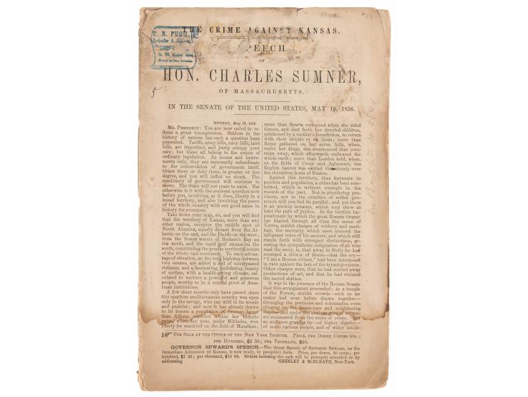Pamphlet entitled "The Crime Against Kansas. Speech of Hon. Charles Sumner, of Massachusetts." NY: New York Tribune, 1856. Bound in publisher's paper wrappers with prospectus advertisement on the reverse, 6 x 9.25, 32 pages. Delivered in the United States Senate on May 19, 1856, Sumner's powerful address condemned the violence perpetrated by pro-slavery forces in the Kansas Territory, criticized the Kansas-Nebraska Act, and harshly attacked Southern politicians. On May 22nd, Representative Preston Brooks brutally beat Sumner over the head with a cane; both men became heroes in their respective regions. In good to very good condition, with heavy overall dampstaining, surface loss affecting the title, and a tear to the upper left corner, passing through the "T. B. Pugh, Bookseller" ink stamp at the head.