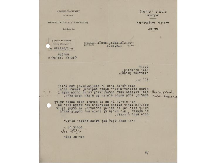 TLS in Hebrew, one page, 7.25 x 8.5, Jewish Community of Palestine, General Council letterhead, December 2, 1931. Letter to an activist colleague, in part (translated): "I will come to Haifa…to organize the local social department…If you still want to help me, meet with me." In fine condition.
