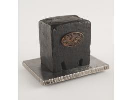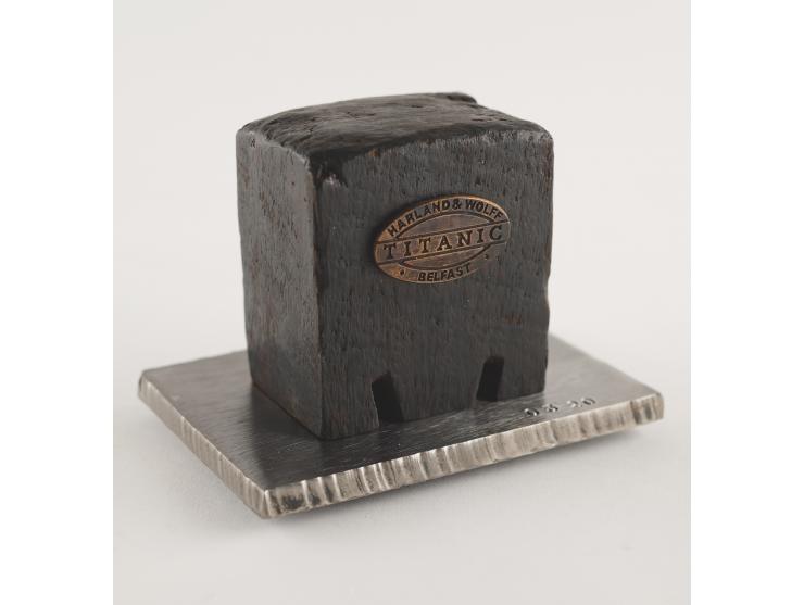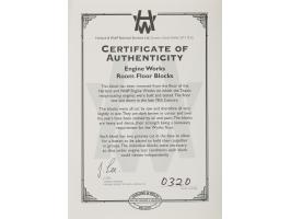 Block of wood removed Harland & Wolff’s Engine Works, measuring 2.75˝ x 3.25˝ x 2˝, with a "Harland & Wolff, Titanic, Belfast" plaque affixed to the front. Includes a metal display stand, the original box, and a certificate of authenticity from Harland & Wolff, in part: "This block has been removed from the floor of the Harland and Wolff Engine Works on which the Titanic reciprocating engines were built and tested…The blocks were all cut by saw and therefore all vary slightly in size. They are dark brown in colour and over the years have been stained by oil and paint. The blocks are heavy and dense, their strength being a necessary requirement for the Works floor. Each block has grooves cut in the base to allow for a batten to be placed to hold them together in groups. The individual blocks were necessary so that under engine test conditions each block could vibrate independently." In fine condition.