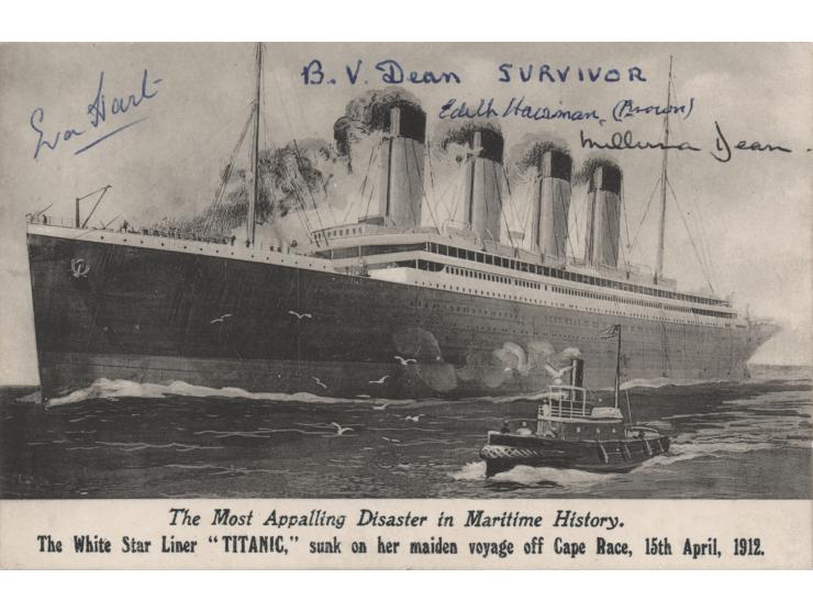 Postcard photo featuring an artistic depiction of the RMS Titanic, 5.5 x 3.5, signed in ballpoint by four survivors of the disaster: Millvina Dean, Bertram Vere Dean, Eva Hart, and Edith Haisman. In very fine condition.