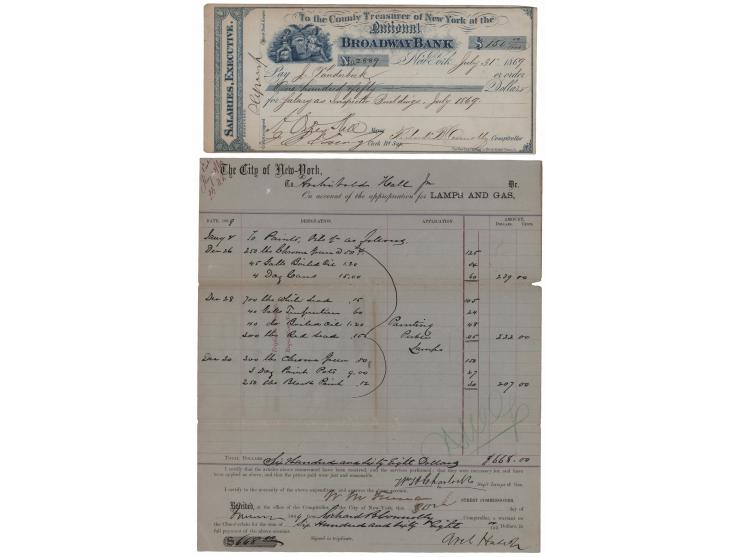 Two documents signed by the Tammany Hall politicians: a DS signed "W. M. Tweed," one page, 8.25 x 9.75, January 30, 1869, being a City of New-York pay order in the amount of $668 for materials used in "painting public lamps"; and a check filled out in another hand and signed by New York City's mayor, "A. Oakey Hall," 8 x 3.75, July 31, 1869, being a check made payable to J, Vanderbeck for $150 as "Salary as Inspector, Buildings." In overall very good to fine condition, with a minor edge chip, light toning, and partial splits to folds of the Tweed document.