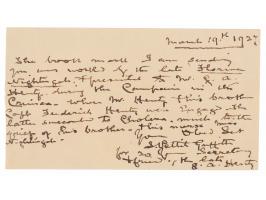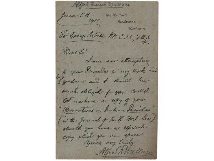ALS signed “Alfred R. Wallace,” one page, 4.5 x 7, personal letterhead, June 5, 1911. Handwritten letter to physician and botanist George Watt, in full: "I am now attempting to grow Primulas in my stock and bog garden; and I should be much obliged if you could let me have a copy of your 'Observations on Indian Primulas' (in the Journal of the R. Hort. Soc.) should you have a separate copy which you can spare." In fine condition, with scattered light foxing.