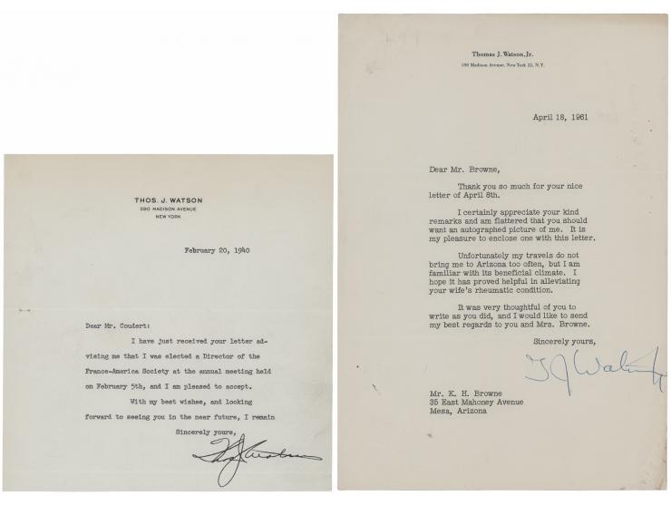Two TLSs from IBM executives Thomas J. Watson and his namesake, Thomas J. Watson, Jr., both one page, 7.25 x 7.5 and 7.25 x 10.5, personal letterhead. The letter from Watson, Sr., signed “Thos. J. Watson,” dated February 20, 1940, reads, in part: “I have just received your letter advising me that I was elected a Director of the France-America Society at the annual meeting held on February 5th, and I am pleased to accept.” The letter from Watson, Jr., signed “T. J. Watson, Jr.,” dated April 18, 1961, in part: “I certainly appreciate your kind remarks and am flattered that you should want an autographed picture of me…Unfortunately my travels do not bring me to Arizona too often, but I am familiar with its beneficial climate.” In overall fine condition.