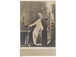 Large ink signature, "Pius PP. X,” on an off-white 9.75 x 2 slip below a handwritten Latin blessing. Affixed to a slightly larger card. In very good to fine condition, with a block of toning from prior display. Accompanied by a large, striking matte-finish 10.75 x 14.25 portrait of Pope Pius X.