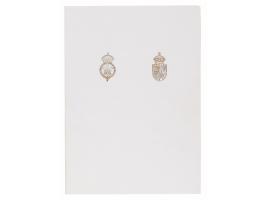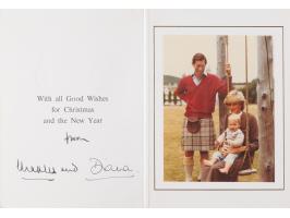 Royal Christmas card from 1983, embossed in gold on the front with the Prince of Wales’s feathers and Order of the Garter motto and the Spencer family arms, measuring 10.5 x 7.25 open, featuring an affixed color photo of Charles in a kilt and Diana sitting on a swing with toddler Prince William, signed inside in fountain pen, “from Charles and” and “Diana.” In fine condition. Accompanied by the original mailing envelope.