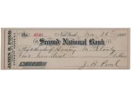 Personal check, 8.25 x 2.75, filled out and signed by lecture manager James B. Pond, "J. B. Pond," payable to Henry M. Stanley for $500, November 26, 1890, endorsed on the reverse by Stanley, "For Deposit acct at the 2d National Bank, New York City, Henry M. Stanley." In fine condition.