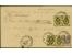 1 k. black/yellow horizontal pair and two singles, together with 1875 10 k. reddish brown/light blue, fresh colours, neatly tied by cds “EKATERINMBOURG 14 SEP. 1880” with framed “ZAKAZNOE” to register...